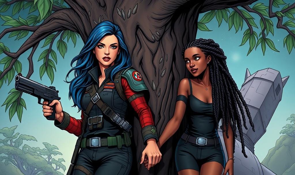 “Did we get our signals crossed?” she said. “You followed me.” She slouched against a geneered tree, the hip where her pistol hung popped out provocatively. Her thumb traced circles on the back of my hand. “You seemed pretty lubed up to pop outta that all-muff dive.”